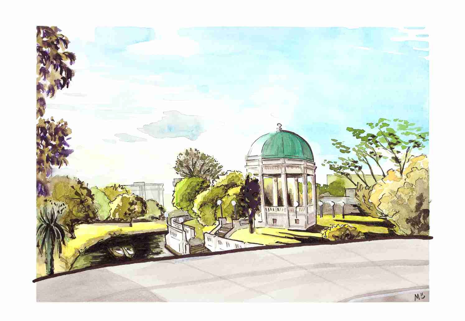 A unique and beautiful view of the beloved Edmonds Rotunda located opposite New Regent Street, along the Avon River in Central Christchurch.