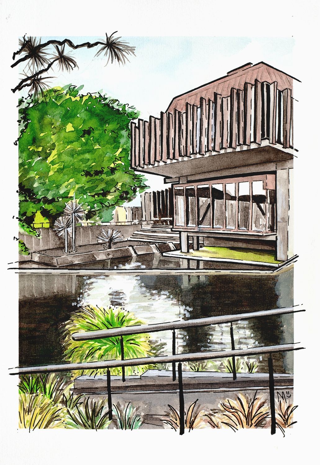 This special artwork is drawn and painted by hand from Margot's own photograph. Margot loves walking around her home town of Christchurch and is inspired by architecture, bright colours and reflections.