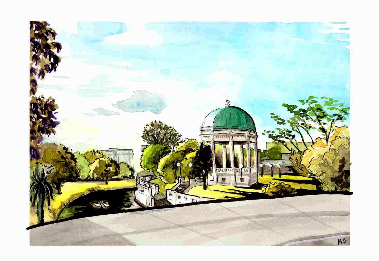 A unique and beautiful view of the beloved Edmonds Rotunda located opposite New Regent Street, along the Avon River in Central Christchurch. This painting is part of Margot's Otautahi, a New Perspective series.